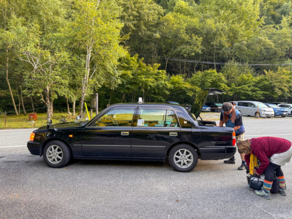 タクシーで高瀬ダムへ移動する。この日の仲間は6人組。3人ずつに分かれ、1台あたり2600円だった。
