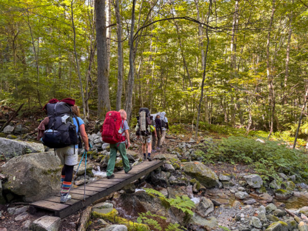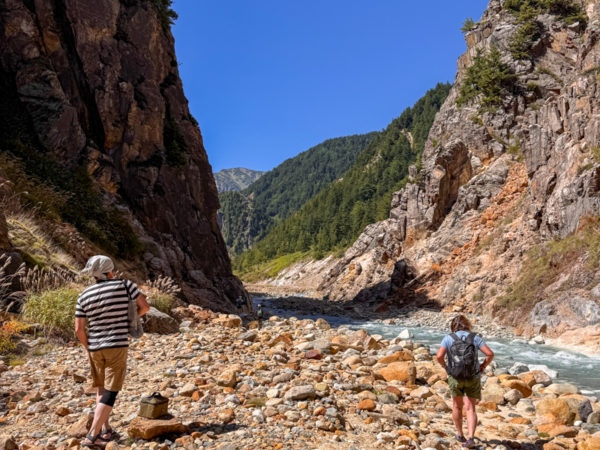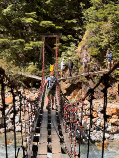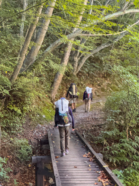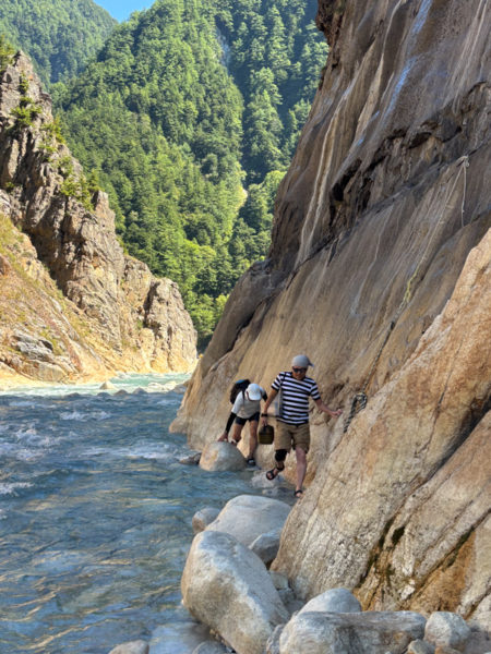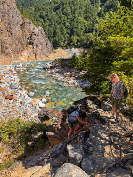 腰までの渡渉や吊り橋、岩場に不安定な足場。
