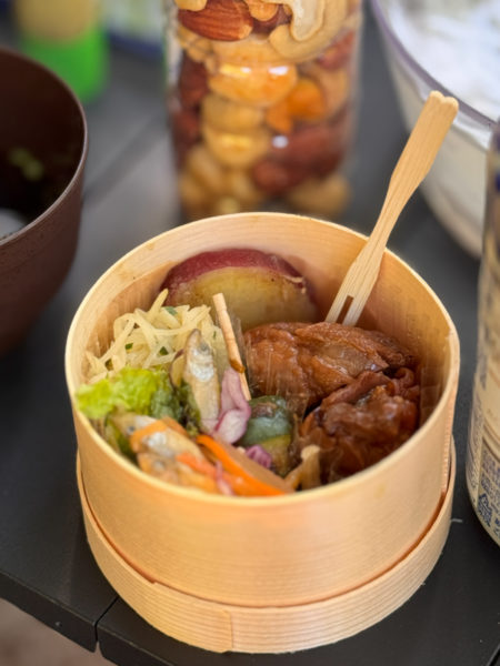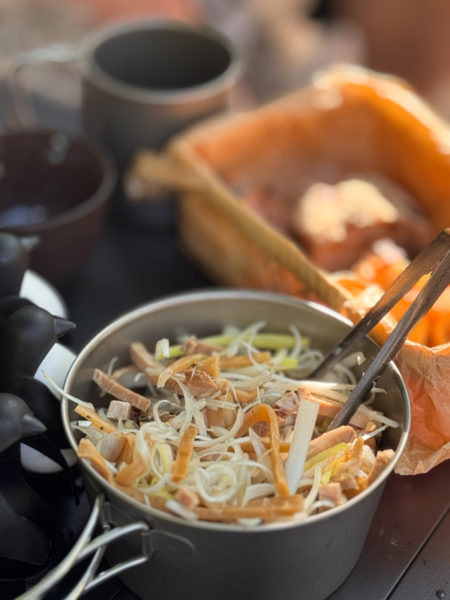いつも世話になっている即席お通しに、米沢牛とネマガリダケのすき焼きと、つぶ貝としめ鯖の刺し身もすごかったが、とにかく今回は宴会隊長のつくる人数分の「朝ごはん」にはびっくり仰天した。