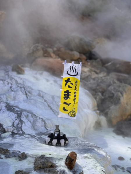 ペンギンのお腹に卵を入れて、源泉に置いておくと温泉卵ができあがる。