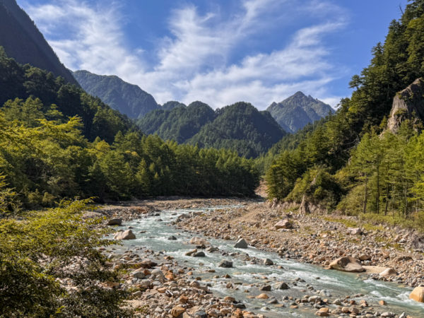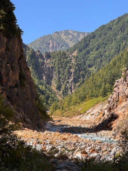 沢もまた綺麗なバスクリン色で、その独特な景色に目を見張る。流れてくる沢の向こうには槍ヶ岳の穂先まで見えていた。