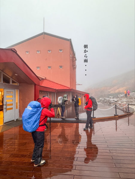 全員レインスーツを着込み、ザックカバーをかけて準備万端。誰一人として「今日はやめようよ!」なんて言わないのが、目的を持って集まった今回の仲間のすごいところだ。