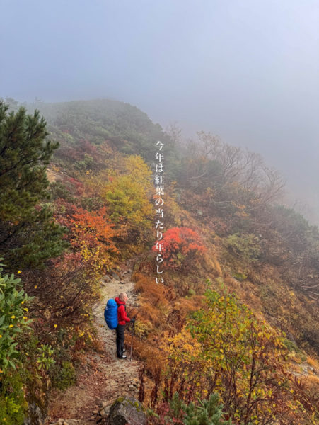 相変わらずの強風と濃霧に四苦八苦しながらの道中だったが、時おり一瞬だけ霧が晴れ、紅葉の山肌が姿を現す。