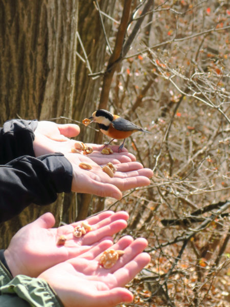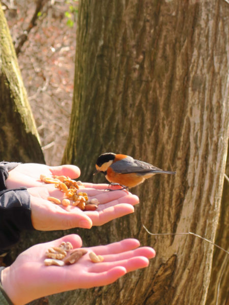 手のひらに乗せたアーモンドを求めて、ひょいと飛んでくる野鳥たち。