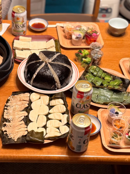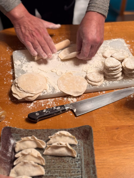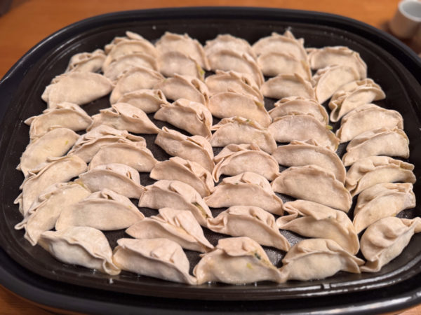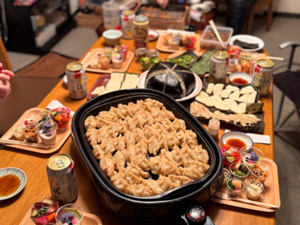 ひとっ風呂浴びて部屋に戻ると、すでに仲間が手づくり餃子の仕込みを始めていた。
