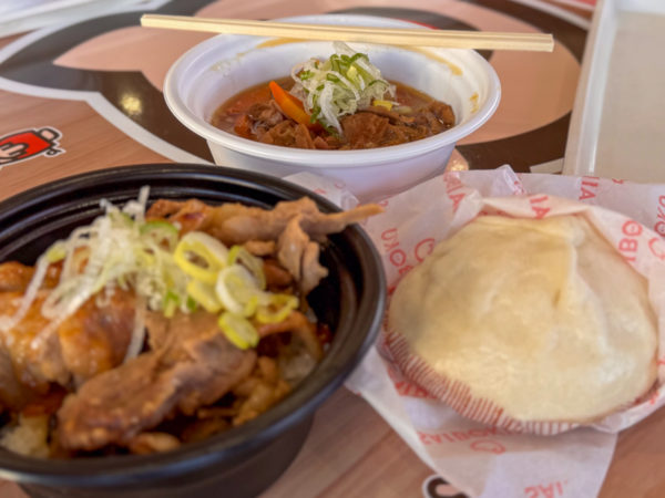 さすがはテーマパークのお肉屋さん。焼肉丼も、もつ煮も、肉まんも美味しい。