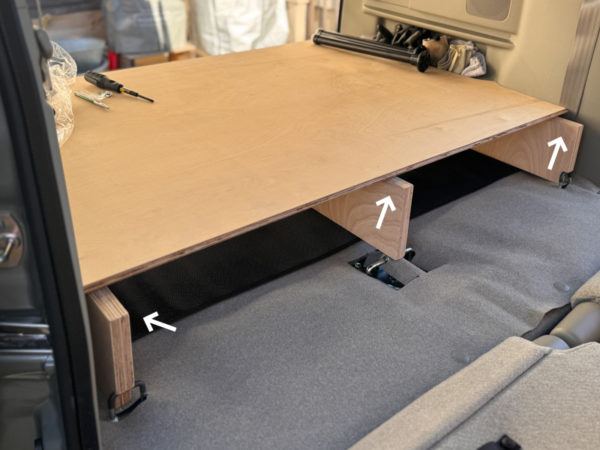3本の桟木を束として荷台に置き、その上に厚さ12mmバーチ(白樺)合板の〝後パネル〟を載せる。