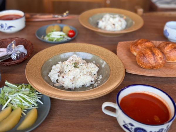 朝ごはんは7時から。リゾットとパンとスープ。今年も変わらぬ美味しさ。