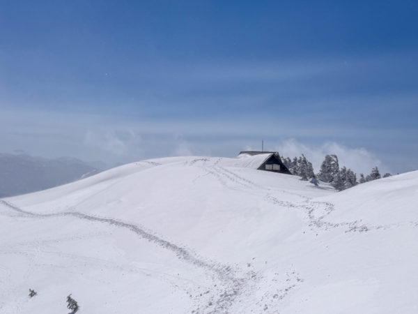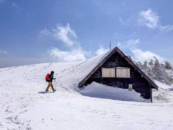 山頂時間を十分に楽しんだあとは、まだ雪に深く埋もれてた〝駒の小屋〟の玄関前で小休止。