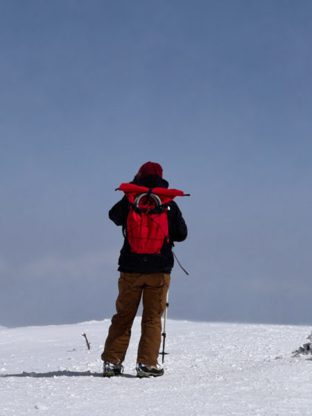 この日の装備は、ワカンをザックに括りつけ、終始12本爪アイゼンとストックで歩いた。