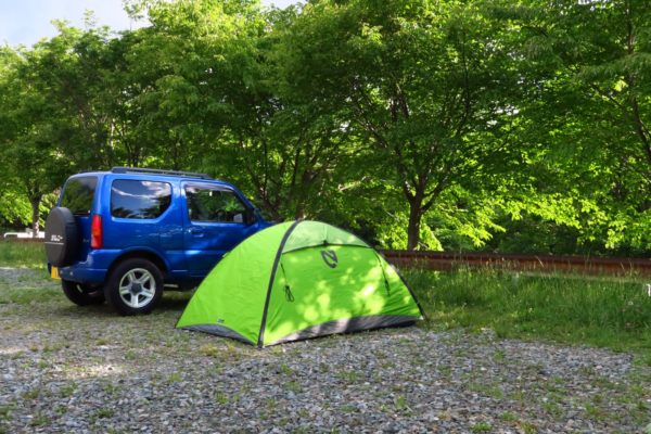 ジムニーでの車中泊は二人だと狭くて眠れないので、今回はテントを邪魔にならない場所に張って車外泊。一気飲みしたビールの力も借りて、とても快適に安眠することができました。