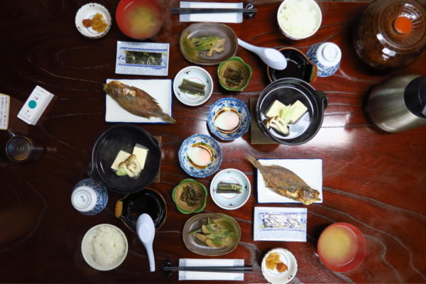 食事は晩ごはんも朝ごはんもあまりにも豪勢でした。17:30分からいただく晩ごはんは、黒薙温泉旅館の宿主である飯田さんの愉快で楽しい説明付きで、食堂で他の方と一緒に各座卓でいただきます。