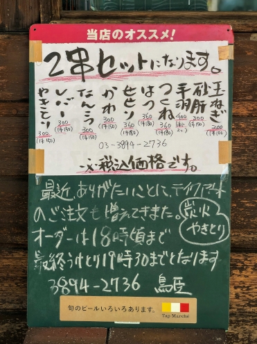 テイクアウトのメニューは全部で10品。他にもできそうなものはつくってくれそうです。焼き鳥は全て2串セットなので、この日はヨメ氏との晩ごはん用にメニューに出ている焼き鳥を全部頼みます。